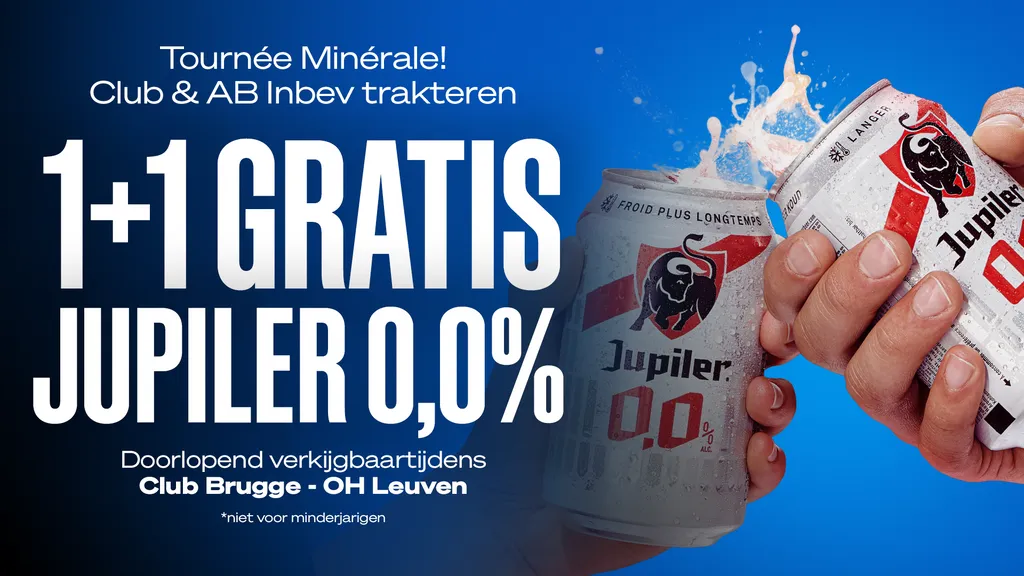 In het kader van Tournée Minérale bundelen Club Brugge en AB InBev opnieuw de krachten om verantwoord alcoholgebruik extra onder de aandacht te brengen. Tijdens de thuiswedstrijd tegen OH Leuven, op zaterdag 21 februari om 18.15 uur, geldt een 1+1 gratis‑actie op Jupiler 0,0%. Zowel voor, tijdens als na de wedstrijd. Met dit initiatief willen Club Brugge en AB InBev het belang van verantwoord alcoholgebruik benadrukken en bijdragen aan de veiligheid van supporters en iedereen in en rond het stadion.